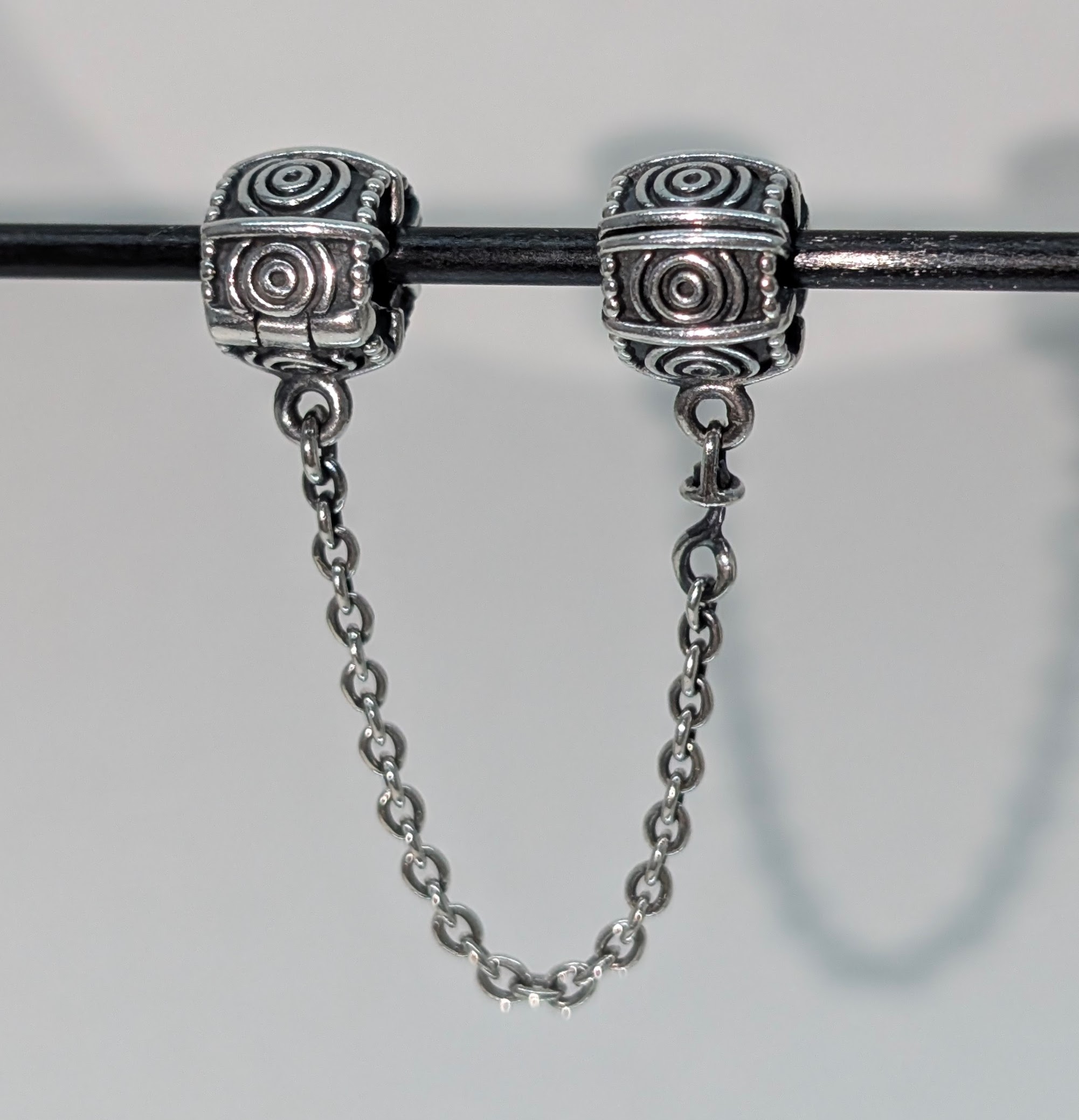Item 101 £15.00 Silver Pandora safety chain with Clip fastening and Spiral detailing.These are great as you don’t need to remove all your charms to remove the safety chain.Great conditionALE 925 makers mark in great condition