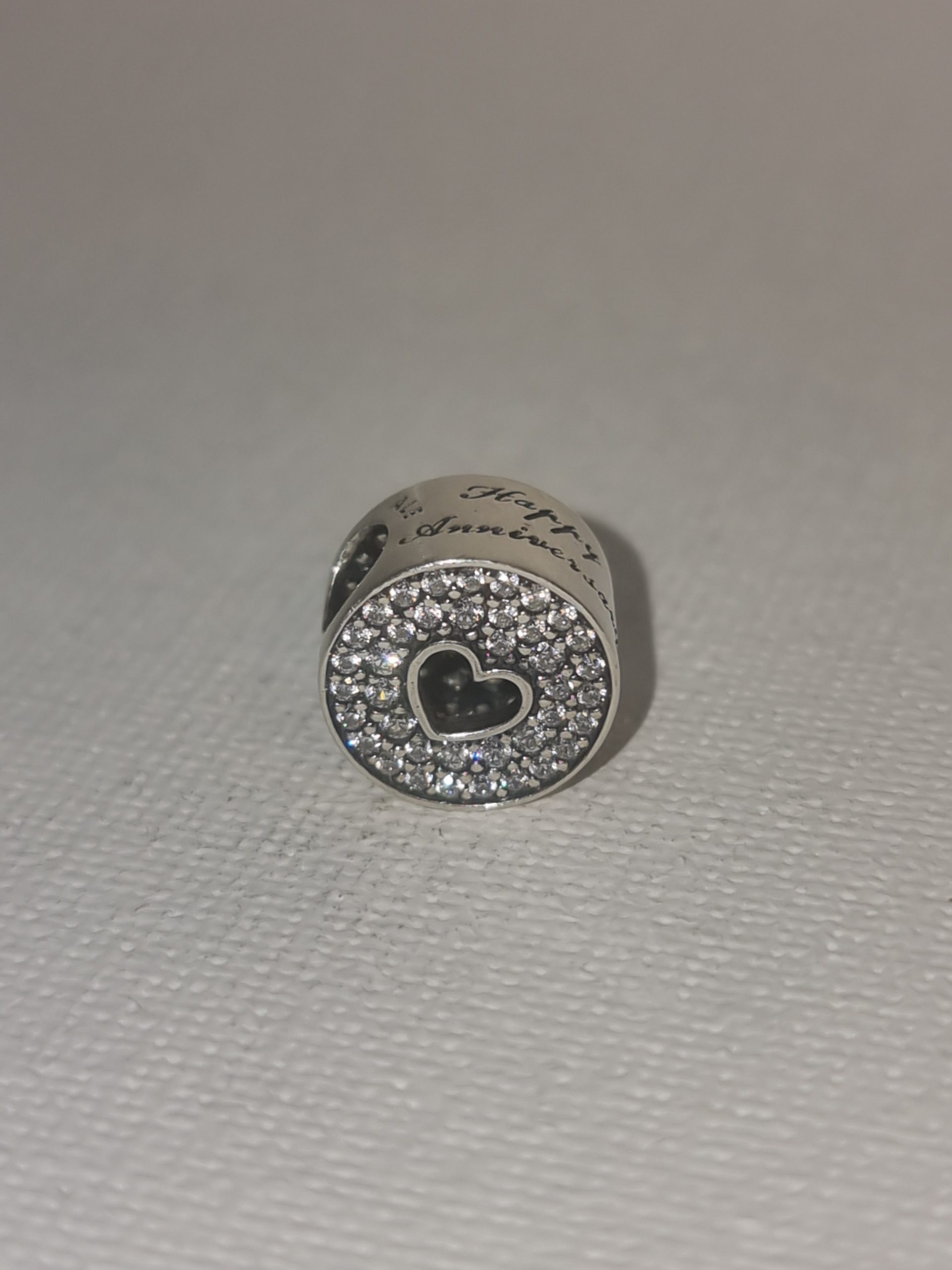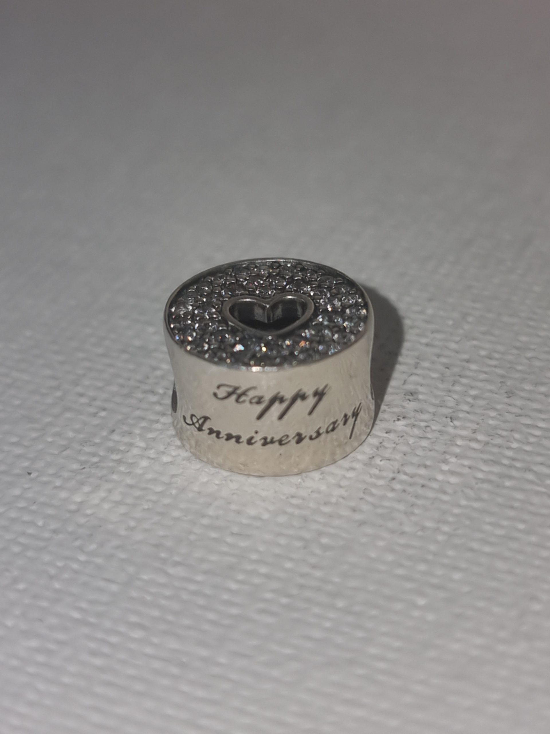 Item 49 £15.00 Silver ‘Happy Anniversary’ pavé charm with heart detailingExcellent conditionALE 925 makers mark in great condition