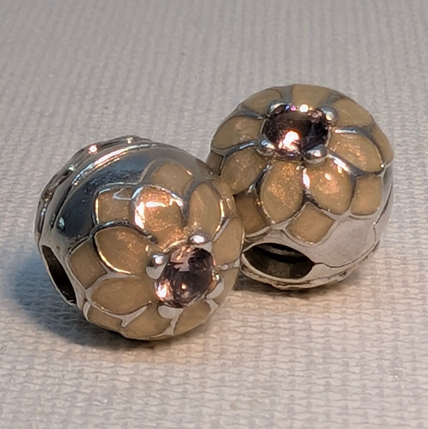 Item 83 £15.00 each or 2 for £25 Silver Peachy Pink Enamel Lotus Flower Clip Charms with Pink GemGreat conditionALE 925 makers mark in great condition 2 x available